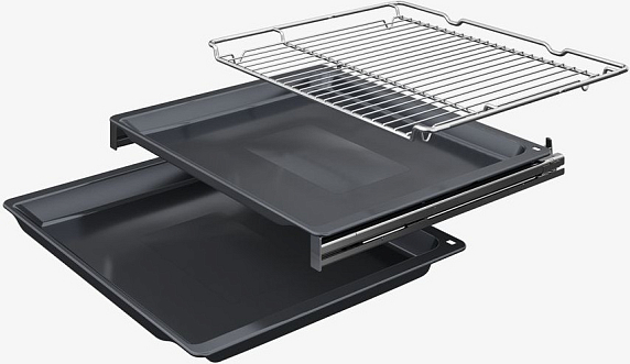 Очистка порадовала: паровая EasyClean реально облегчает жизнь, а каталитические стенки снижают необходимость тереть каждый угол. Внутри эмаль, ничего не прилипает. Направляющие Comfort-Flex с телескопическим выдвижением — практичная вещь, противень легко вытащить даже с горячим блюдом. Комплект аксессуаров оказался достаточным: два противня и решётка — сразу можно готовить.