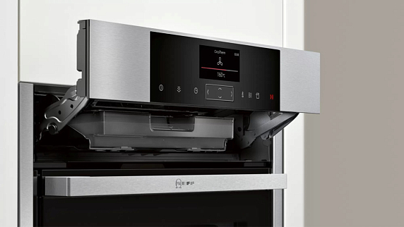 А функция «Шаббат», которая поддерживает постоянную температуру внутри духовки, обеспечивает равномерное приготовление блюд без необходимости вашего контроля. При этом нет световых или звуковых сигналов. Конструкция продуманная: система охлаждения сохраняет корпус от перегрева. Навесные направляющие гарантируют комфорт эксплуатации. Резервуар для воды объемом один литр находится за панелью управления. Сенсорную контрольную панель духового шкафа Нефф B45FS24N0 можно заблокировать от случайного изменения настроек, защита от перегрева также присутствует.