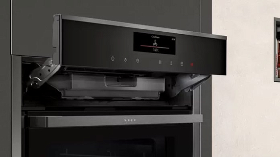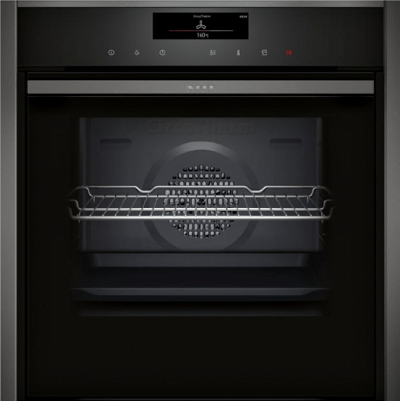 При открывании дверца плавно исчезает в нише под рабочей камерой, не уменьшая объем духовки и обеспечивая удобный доступ к готовящимся блюдам. При помощи индикаторов остаточного тепла вы сможете определить состояние камеры после завершения приготовления блюда, насколько сильно нагрета она нагрета. Для управления духовым шкафом Нефф B48FT68G1 используется сенсорная панель, обладающая впечатлительной чувствительностью. Она достаточна проста в освоение, поэтому будет понятна абсолютно каждому пользователю.