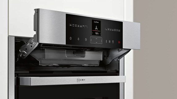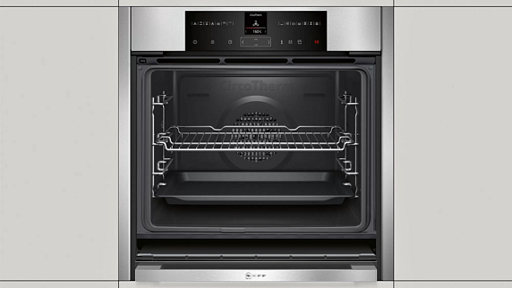 Духовой шкаф Neff B55VR22N0 прекрасно подойдет для тех, кто умеет и любит готовить. Этот прибор поможет создавать на кухне блюда ресторанного уровня. Он оснащен системой CircoTherm — уникальной разработкой бренда. Благодаря ей, горячий воздух равномерно распределяется по рабочей камере, обеспечивая корректное пропекание. Неважно, сколько противней установлено внутри, один или три, любая пища приготовится оптимально. Дверца создана по технологии Slide & Hide. Она не просто откидывается, а убирается внутрь корпуса: во-первых, так удобнее доставать и загружать продукты, во-вторых, меньше риск обжечься.