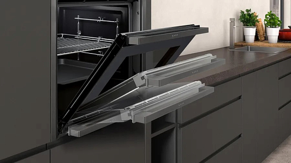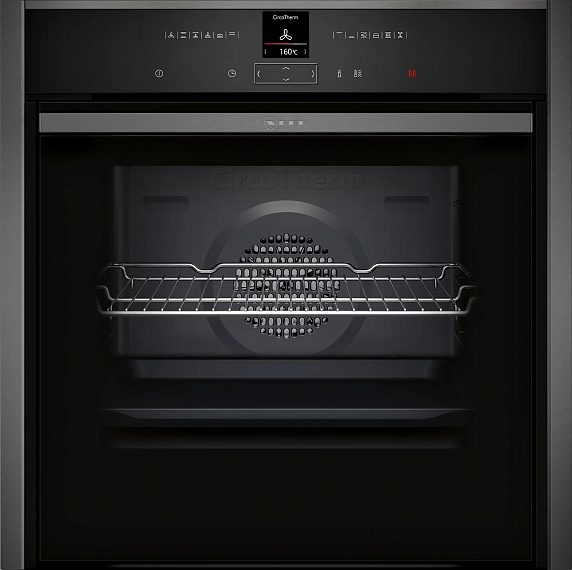Система тангенциального охлаждения благодаря мощному вентилятору создает вокруг духовки воздушный барьер. Движущийся в нем воздух препятствует утечке тепла и позволяет защитить от перегрева как поверхность духового шкафа, так и кухонную мебель, в которую он установлен. В духовой шкаф Нефф B57CR25G0 встроен дисплей, который используется для визуального отображения информации. А для работы с оборудованием используется сенсорная панель.