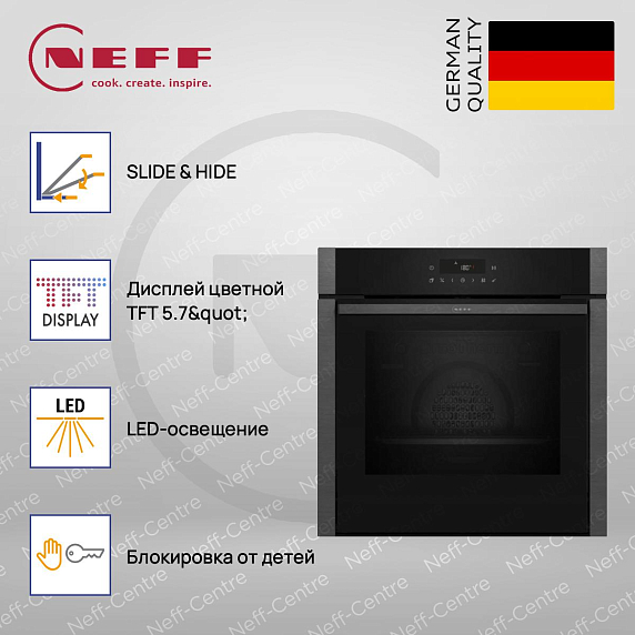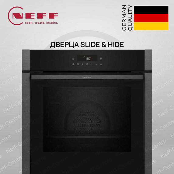 Духовой шкаф Neff B5ACJ7AG3 — это сочетание элегантного дизайна и продуманных технологий. Черный цвет корпуса дополняется графитово-серыми элементами фурнитуры. Уникальная особенность — дверца SLIDE & HIDE, которая полностью прячется вниз при открытии, обеспечивая максимальный доступ к внутренней камере. Эмалированная камера объемом 71 литр позволяет готовить большое количество блюд одновременно.