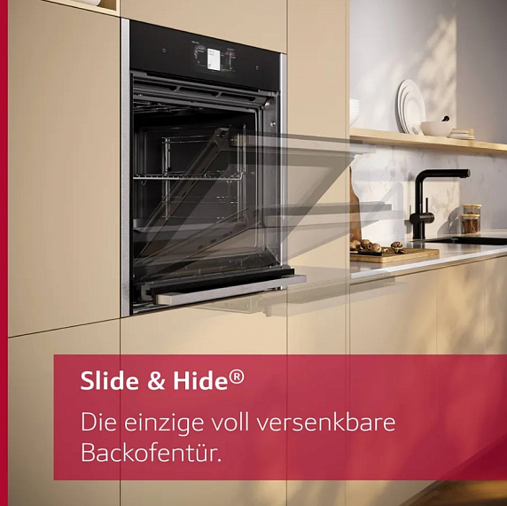 Отдельно отмечу удобную дверцу SLIDE & HIDE с мягким закрыванием SoftMove — не нужно толкать тяжёлые противни, дверь уезжает в нишу и не мешает. Домой подключила через Home Connect — удобно стартовать заранее, следить по телефону и получать уведомления. LED-освещение яркое, внутренняя эмаль легко отмывается, а индикатор фактической температуры помогает точно следовать рецепту.