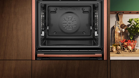 Neff B69VS7MY0 воплотило в себе передовые технологии, премиальный дизайн и безупречное качество. Один из ключевых элементов духового шкафа — это его дверца. Она выполнена по уникальной технологии SLIDE & HIDE, что обеспечивает максимальное удобство при использовании. Дверца открывается при помощи ручки Slide и убирается в нижнюю часть шкафа, обеспечивая свободный доступ к блюдам. Особое внимание заслуживает функция добавления пара VarioSteam. Это позволяет сохранить витамины и полезные элементы в продуктах, придавая блюдам неповторимый вкус и аромат. Модель выполнена в стильном черном цвете, а цвет фурнитуры можно выбрать по желанию, благодаря чему он легко впишется в любой интерьер. Внутренняя камера покрыта эмалью, что обеспечивает легкость в уходе и долговечность. Объем духового шкафа составляет 71 литр, что позволяет готовить сразу несколько блюд. Для удобства есть 20 режимов нагрева. Очистка духового шкафа не требует особых усилий благодаря пиролитической и паровой системам очистки Pyrolyse и EasyClean.