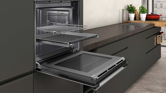 Есть в модели духового шкафа Нефф B1ACE1BN0R и таймер, который может работать, как песочные часы. Это удобно во время приготовления яиц. Он работает независимо от режима и других функций времени и не влияет на работу прибора. При желании можно выставить и определенное время окончания готовки, и тогда духовка выключится сама в указанное время.