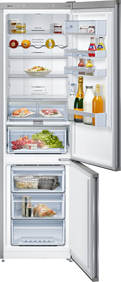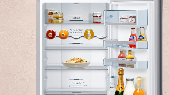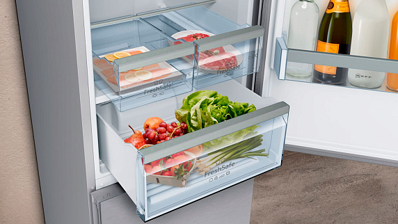 Холодильники Neff оборудованы зоной FreshSafe, специально разработанной для поддержания идеального уровня температуры и влажности. Эта инновационная функция позволяет создать оптимальные условия для хранения продуктов, поддерживая их в идеальном состоянии на значительно более длительный срок, чем обычные холодильные отсеки. Вам больше не придется беспокоиться о быстрой потере свежести ваших продуктов.