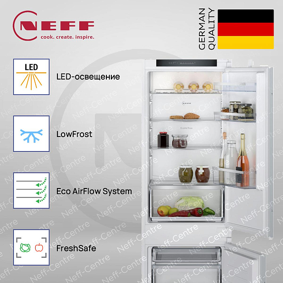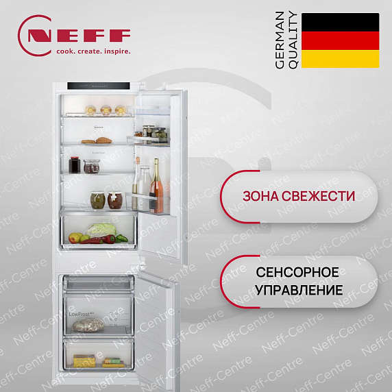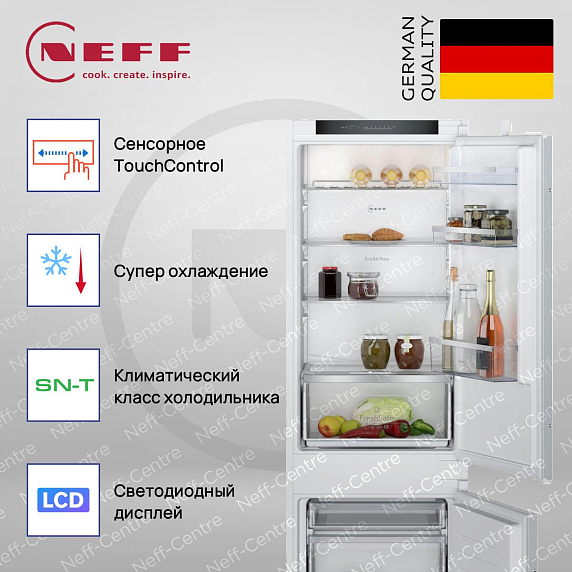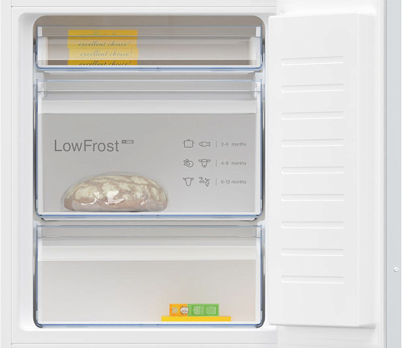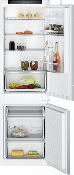 Встраиваемая холодильная морозильная комбинация Neff KI5862SE0S — это идеальное решение для тех, кто ценит функциональность и стиль в интерьере кухни. С высотой 193.5 см, шириной 54.1 см и глубиной 54.8 см, этот прибор легко встраивается в колонну, гармонично вписываясь в общий дизайн помещения. Общий полезный объем составляет 267 литров, что позволяет хранить большое количество продуктов. Холодильное отделение объемом 183 литра оснащено капельной системой охлаждения и автоматической системой размораживания, что обеспечивает равномерное распределение температуры и предотвращает образование льда. Система суперохлаждения позволяет быстро охладить свежие продукты, сохраняя их полезные свойства и свежесть. Морозильное отделение объемом 84 литра с системой LowFrost требует ручного размораживания, но благодаря этому обеспечивает более эффективное использование пространства и сниженное образование инея.