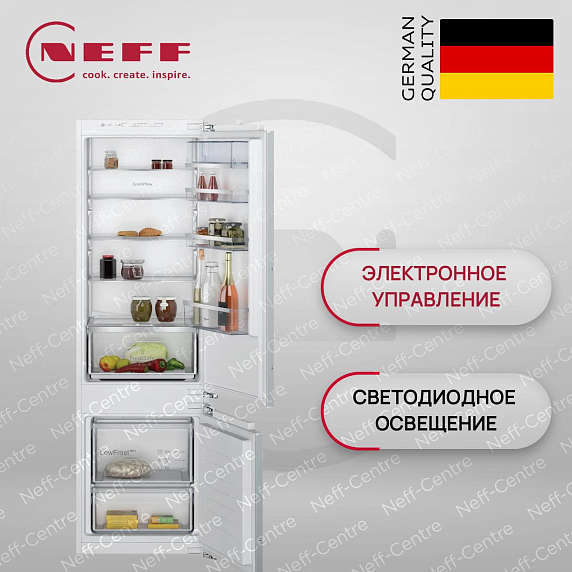Встраиваемая холодильно-морозильная комбинация Neff KI5872FE0 — двухкамерная модель, которая предназначена для встраивания, она имеет габариты: ширина — 54,1 см, глубина — 54,8 см, высота — 177,2 см. Такие параметры универсальны, и они удобны для размещения техники даже на небольшой кухне. Оборудование выполнено в белом цвете и подойдет к вашему интерьеру помещения. Если Вы не закрыли дверцу холодильника до конца, то акустическая индикация оповестит об этом. Помимо этого, светодиодная подсветка ярко освещает внутреннее пространство камеры и отличается долговечностью и потребляет минимум электроэнергии.
