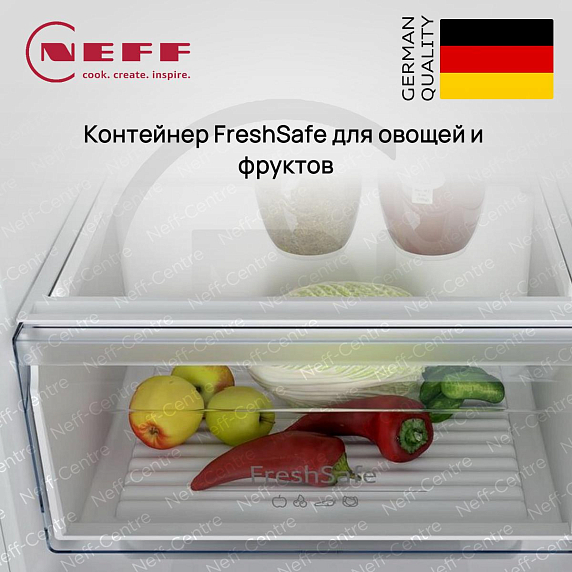 Холодильники Neff оборудованы зоной FreshSafe, специально разработанной для поддержания идеального уровня температуры и влажности. Эта инновационная функция позволяет создать оптимальные условия для хранения продуктов, поддерживая их в идеальном состоянии на значительно более длительный срок, чем обычные холодильные отсеки. Вам больше не придется беспокоиться о быстрой потере свежести ваших продуктов.