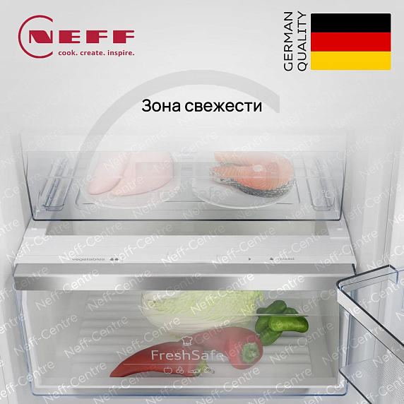 Холодильники Neff оборудованы зоной FreshSafe, специально разработанной для поддержания идеального уровня температуры и влажности. Эта инновационная функция позволяет создать оптимальные условия для хранения продуктов, поддерживая их в идеальном состоянии на значительно более длительный срок, чем обычные холодильные отсеки. Вам больше не придется беспокоиться о быстрой потере свежести ваших продуктов.