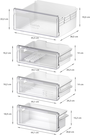 Морозильное отделение объемом 75 литров оснащено системой NoFrost, которая предотвращает образование наледи, и также имеет автоматическую разморозку. Три ящика обеспечивают удобное хранение замороженных продуктов, а ванночка для льда добавляет удобство использования. Зона свежести FreshSafe поддерживает оптимальные условия для хранения овощей и фруктов, продлевая их срок годности.