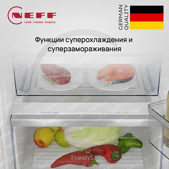 Холодильники Neff оборудованы зоной FreshSafe, специально разработанной для поддержания идеального уровня температуры и влажности. Эта инновационная функция позволяет создать оптимальные условия для хранения продуктов, поддерживая их в идеальном состоянии на значительно более длительный срок, чем обычные холодильные отсеки. Вам больше не придется беспокоиться о быстрой потере свежести ваших продуктов.