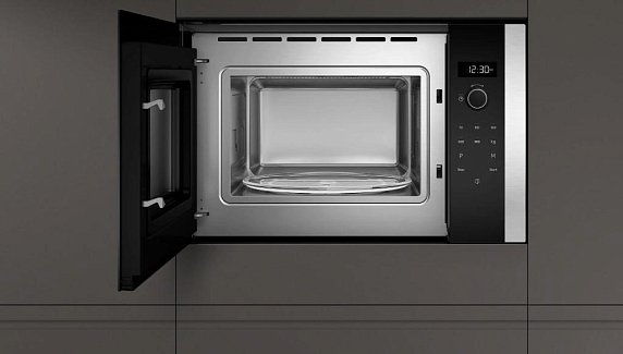Внутренняя камера объёмом 25 литров выполнена из высококачественной нержавеющей стали, что гарантирует долговечность и простоту ухода. Благодаря стеклянной вращающейся тарелке диаметром 31.5 см обеспечивается равномерное распределение микроволн, что позволяет добиться идеального результата при разогреве или приготовлении пищи. Дверца с упором слева обеспечивает удобный доступ к содержимому, а светодиодное освещение позволяет контролировать процесс приготовления без необходимости открывать устройство.