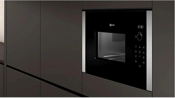 Встраиваемая микроволновая печь Neff HWB23 с рабочей камерой объемом 20 литров оборудована навесной дверцей, открывание которой осуществляется посредством нажатия кнопки. Для установки времени приготовления предусмотрен утапливаемый переключатель, для выбора режимов нагрева — сенсорные кнопки. Небольшая глубина и высота позволяют встраивать эту модель в любом удобном месте. Внутренняя камера устройства изготовлена из надежной и легко моющейся нержавеющей стали. 5 уровней мощности микроволн помогут подобрать режим для любого блюда. Специальный режим предназначен для размораживания продуктов.