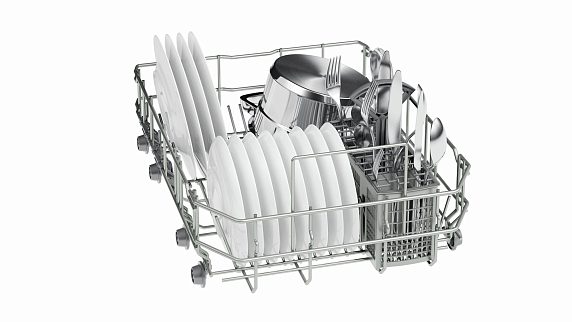 Удобная загрузка — еще один технический плюс модели: благодаря коробам Vario посуда грамотно распределяется, имеются направляющие для тарелок, отдельная корзина для столовых приборов. Верхний короб регулируется по высоте.