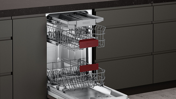 Система RackMatic-3 в посудомоечных машинах Neff преобразует процесс загрузки посуды, предоставляя пользователю безграничные возможности для оптимизации внутреннего пространства. Благодаря возможности легко поднимать или опускать верхний короб даже при полной загрузке, вы получаете свободу распоряжаться пространством посудомоечной машины согласно своим потребностям. Это особенно актуально, когда необходимо поместить внутрь высокие бокалы или крупногабаритные тарелки и кухонные принадлежности.