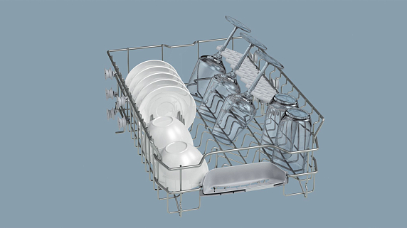 Система RackMatic-3 в посудомоечных машинах Neff преобразует процесс загрузки посуды, предоставляя пользователю безграничные возможности для оптимизации внутреннего пространства. Благодаря возможности легко поднимать или опускать верхний короб даже при полной загрузке, вы получаете свободу распоряжаться пространством посудомоечной машины согласно своим потребностям. Это особенно актуально, когда необходимо поместить внутрь высокие бокалы или крупногабаритные тарелки и кухонные принадлежности.