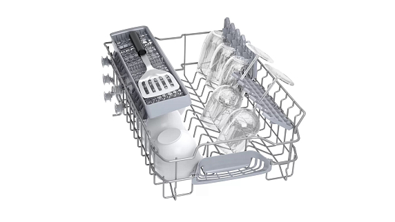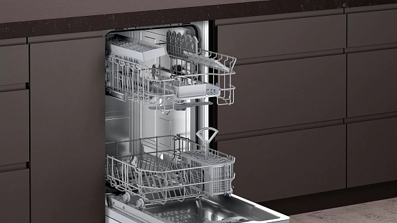 Система RackMatic-3 в посудомоечных машинах Neff преобразует процесс загрузки посуды, предоставляя пользователю безграничные возможности для оптимизации внутреннего пространства. Благодаря возможности легко поднимать или опускать верхний короб даже при полной загрузке, вы получаете свободу распоряжаться пространством посудомоечной машины согласно своим потребностям. Это особенно актуально, когда необходимо поместить внутрь высокие бокалы или крупногабаритные тарелки и кухонные принадлежности.