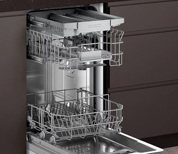 Ширина посудомоечной машины NEFF S855HMX50R равна 45 см, значит, оно относится к типу узких, которые обычно размещают на небольшие кухни. Вместимость такого прибора — 10 комплектов и один сервировочный. Также пользователь может воспользоваться половинной загрузкой, при которой будут задействованы верхний и нижний короб, а расход времени, воды и электроэнергии сократится.