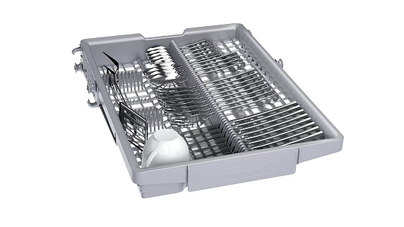 При необходимости вы можете использовать дополнительные программы, а именно предварительное ополаскивание и еще одно полоскание, если это нужно. Посудомоечную машину можно использовать для мытья детской посуды или приборов, которыми пользуются аллергики, ведь с режимом работы Гигиена+ все аллергены надежно удаляются с каждого кусочка посуды. Для удобства в данной модели предусмотрено автоматическое распознавание средств 3в1, вы можете использовать их для удобства, чтобы не подбирать индивидуально моющую химию. Конструкция короба, куда непосредственно помещается посуда и столовые приборы, очень удобен. Он имеет множество складных перекладин, специальных отделений, лоток для столовых приборов, все будет на своих местах.