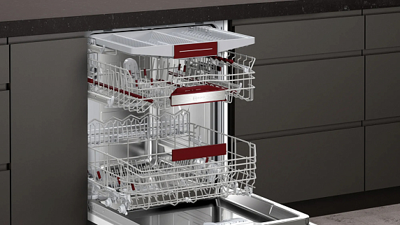 Система RackMatic-3 в посудомоечных машинах Neff преобразует процесс загрузки посуды, предоставляя пользователю безграничные возможности для оптимизации внутреннего пространства. Благодаря возможности легко поднимать или опускать верхний короб даже при полной загрузке, вы получаете свободу распоряжаться пространством посудомоечной машины согласно своим потребностям. Это особенно актуально, когда необходимо поместить внутрь высокие бокалы или крупногабаритные тарелки и кухонные принадлежности.