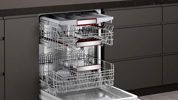 Система RackMatic-3 в посудомоечных машинах Neff преобразует процесс загрузки посуды, предоставляя пользователю безграничные возможности для оптимизации внутреннего пространства. Благодаря возможности легко поднимать или опускать верхний короб даже при полной загрузке, вы получаете свободу распоряжаться пространством посудомоечной машины согласно своим потребностям. Это особенно актуально, когда необходимо поместить внутрь высокие бокалы или крупногабаритные тарелки и кухонные принадлежности.