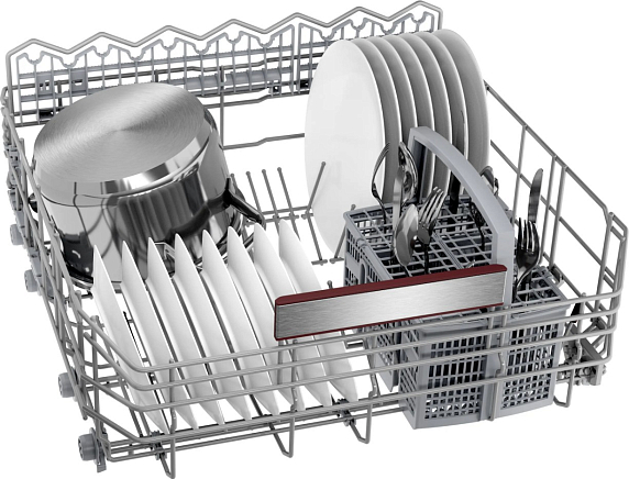 Техника оснащена шестью программами, среди которых есть автоматическая (45-65°C), быстрая (60°C), экономичная (50°C), а также специализированные режимы IntensiveZone и Гигиена+ для особо тщательной очистки и дезинфекции. Функция Open Dry (Эко сушка) и теплообменник обеспечивают бережную сушку без разводов, а дополнительная экстра-сушка делает результат безупречным даже для сложных предметов. VarioSpeed Plus позволяет ускорить выполнение программы, не снижая качества мытья. Для столовых приборов предусмотрена отдельная корзина, а складные направляющие для тарелок в нижней корзине (8 штук) обеспечивают гибкость загрузки.