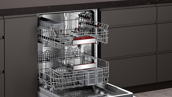 Система RackMatic-3 в посудомоечных машинах Neff преобразует процесс загрузки посуды, предоставляя пользователю безграничные возможности для оптимизации внутреннего пространства. Благодаря возможности легко поднимать или опускать верхний короб даже при полной загрузке, вы получаете свободу распоряжаться пространством посудомоечной машины согласно своим потребностям. Это особенно актуально, когда необходимо поместить внутрь высокие бокалы или крупногабаритные тарелки и кухонные принадлежности.