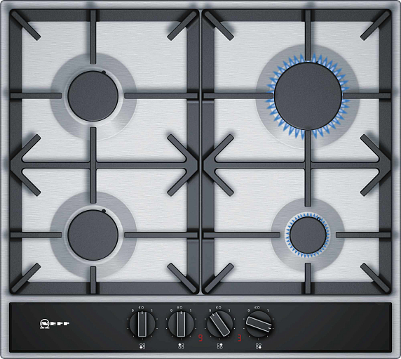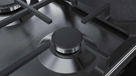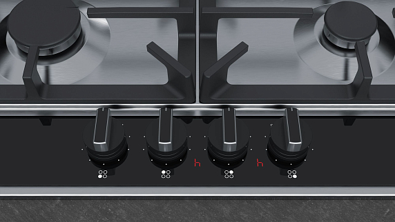 Варочная поверхность имеет газовый тип питания. Для обеспечения безопасности она оснащена термоэлектрической защитой от утечки газа, которая вовремя прекратит подачу газа, если пламя затухнет. Для того, чтобы избежать ожогов, есть индикация тепла. Управление осуществляется с помощью поворотных переключателей. Они вращаются легко и плавно, не нужно прилагать много усилий, вы просто поворачиваете переключатель до нужной мощности пламени. Их, кстати, девять. Благодаря технологии FlameSelect пламя не затухает даже на самой маленькой мощности.