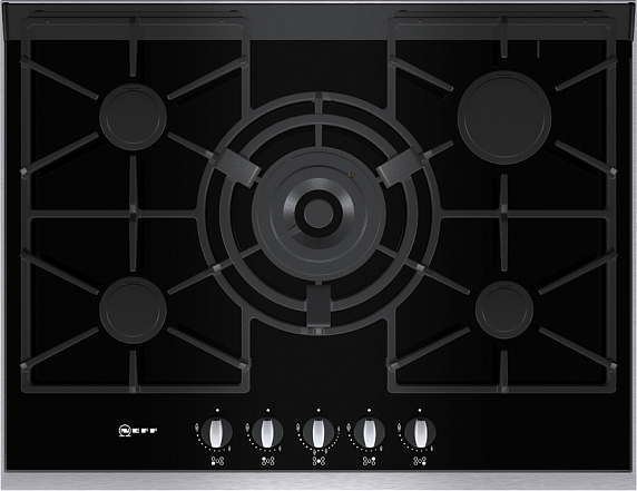 Варочная панель Neff T67S76N0 из стеклокерамики черного цвета оснащена пятью газовыми горелками. Посередине панели расположена двухконтурная wok-конфорка, благодаря которой можно разнообразить привычный рацион и порадовать своих родных и близких блюдами восточной кухни. Стильный дизайн панели прекрасно будет сочетаться с другими видами бытовой техники.
