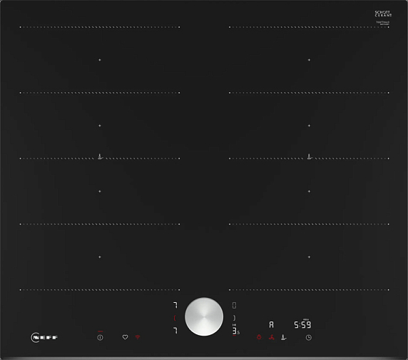 Варочная панель оборудована 2-ступенчатой индикацией остаточного тепла, защитным отключением, главным выключателем и блокировкой от детей. Управление панелью осуществляется с помощью электронных сенсорных переключателей TouchControl и съемного переключателя TwistPad. На дисплее отображается всю необходимую информацию о процессе приготовления пищи. Кроме того, панель оснащена таймером с функцией отключения, цифровой индикацией выбранной ступени нагрева, и функцией HomeConnect, которая позволяет управлять панелью через Bluetooth и Wi-Fi. На панели расположены 4 конфорки, каждая из которых имеет зону FlexZone для гибкого использования различного размера посуды.