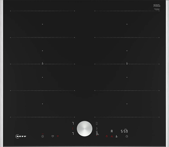 Индукционная варочная панель Neff T66TTX4L0 представляет собой полноразмерную модель на четыре конфорки для монтажа над столешницей. Ее черная стеклокерамическая поверхность в стальной рамке выглядит минималистично и строго, легко вписываясь в разные стили кухни. Управлять панелью можно двумя способами: напрямую через сенсорную зону TouchControl или с помощью магнитного диска TwistPad, который удобно держать в руке и можно снять для очистки поверхности. На ярком TFT-дисплее отображаются текущие настройки, уровень мощности и работа таймера. Четыре конфорки прямоугольной формы (23×19 см) имеют по 17 ступеней мощности, а две центральные можно объединить в одну большую зону FlexZone для длинной посуды.